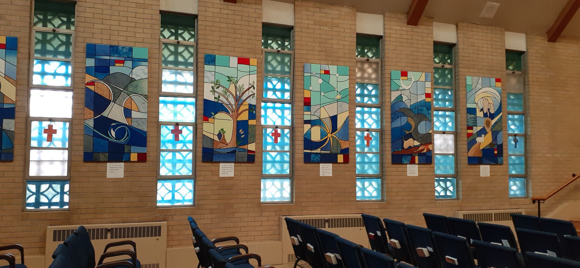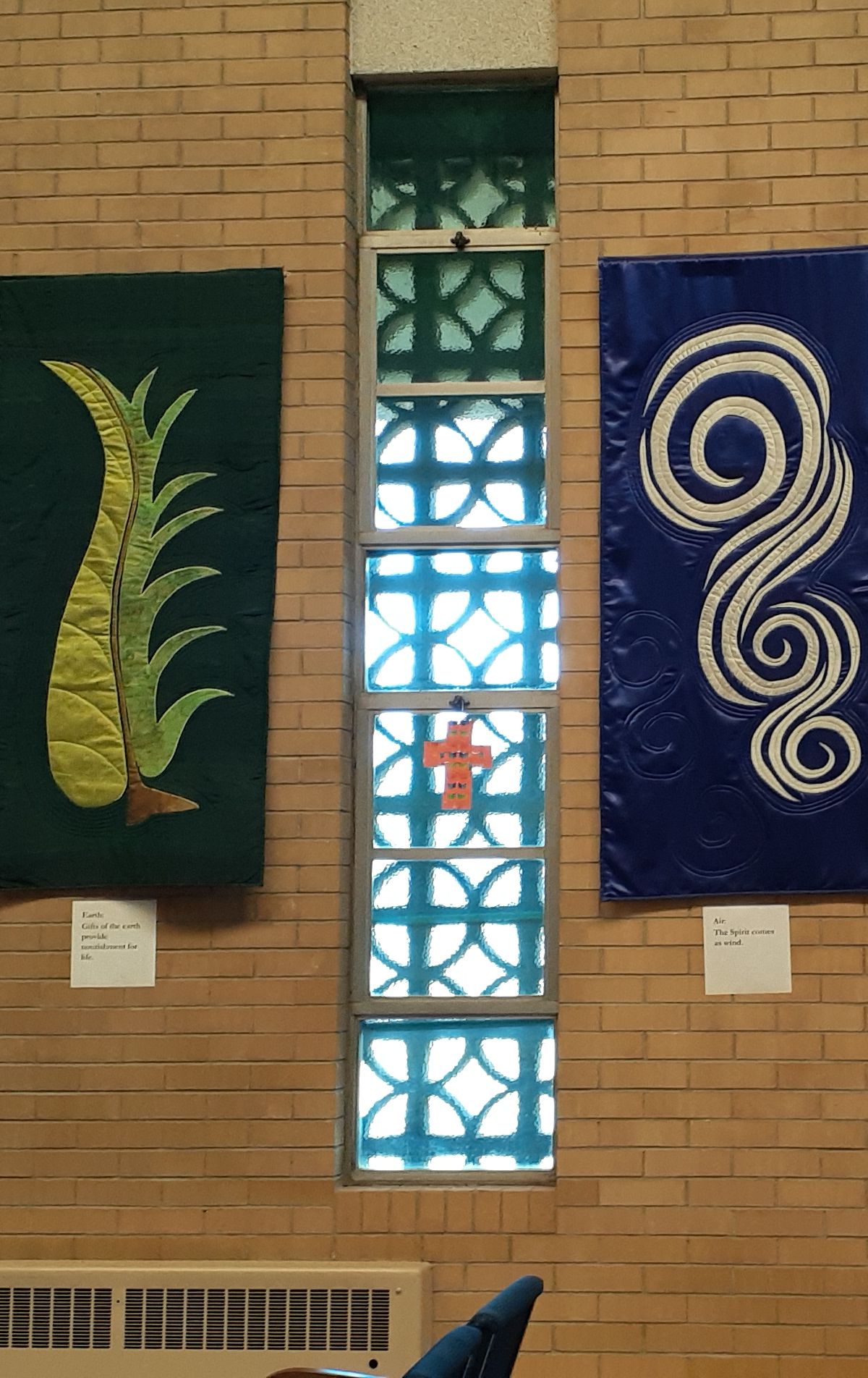These banners hang in the sanctuary and are adapted from a Watkins Stained Glass design.